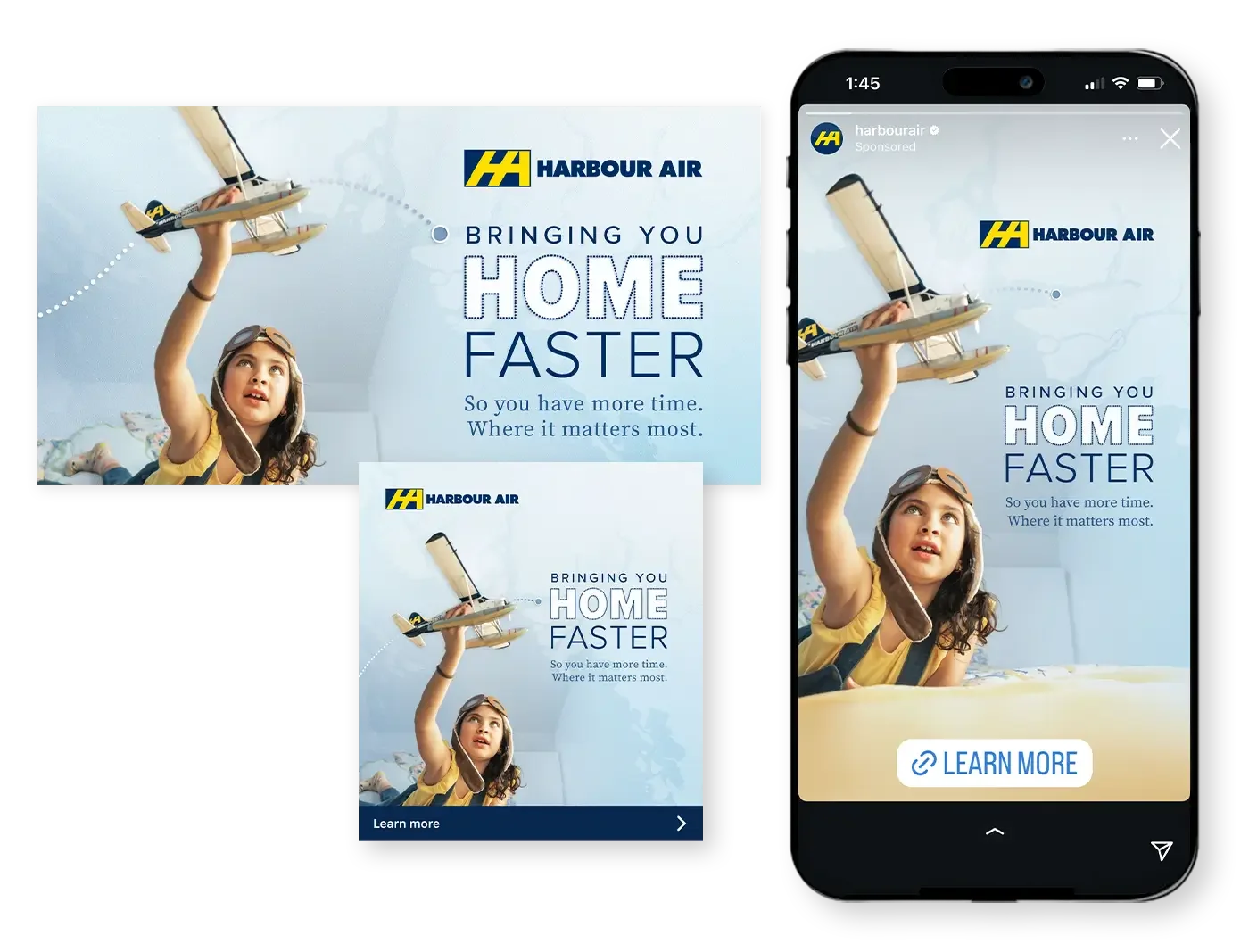 The Harbour Air brand remained central through consistent use of the toy plane visual, reinforcing recognition across all formats. Each ad unit drove to a dedicated landing page that outlined the value of flying Harbour Air.